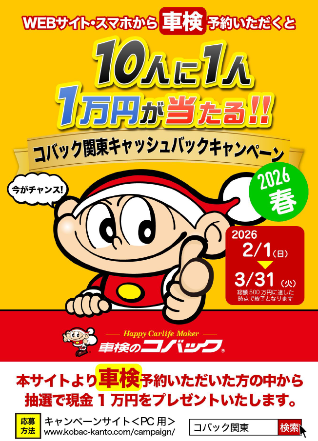 車検の専門店である車検のコバック印西小林店では、車検のご予約いただいた方の中から抽選で1万円をプレゼントいたします。