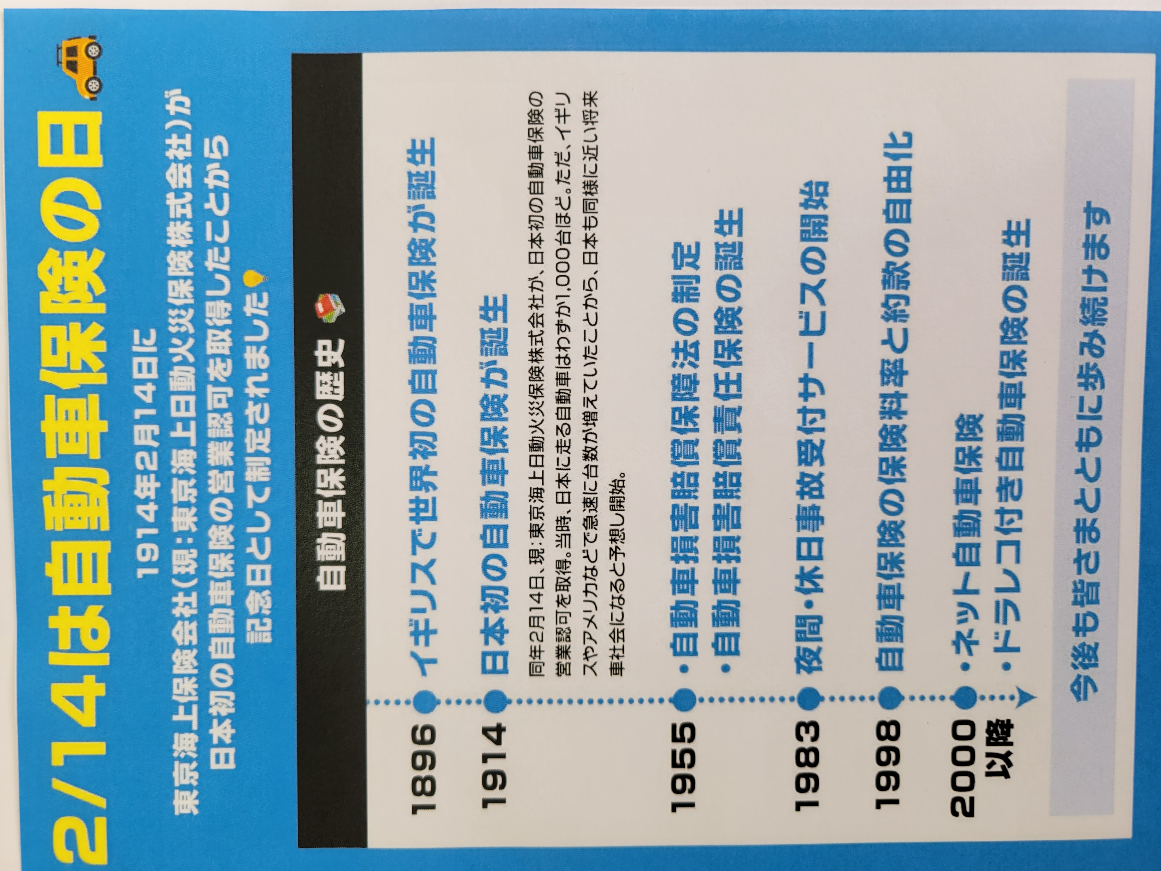 1914年2月14日に日本で初めて自動車保険の営業認可を取得したのが東京海上保険会社でした!とのことで記念日に制定された